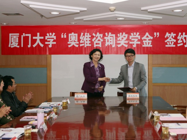 The Signing Ceremony for All View Consulting Scholarship, founded by All View Consulting Ltd., took place on May 9th. Zhan Xinli, vice-president of Xiamen University, and Sheng Zhe, vice-president of All View Consulting Ltd. signed the agreemen . Attendees included Li Chunlan, deputy general manager and Qian Yufei , deputy director, of All View Consulting Ltd., and principals of Xiamen University General Office, Students' Affairs Office, Graduate School, Academic Affairs Office, and Communist Youth League Committee .Huang Baoqiu, deputy director of General Office, hosted.