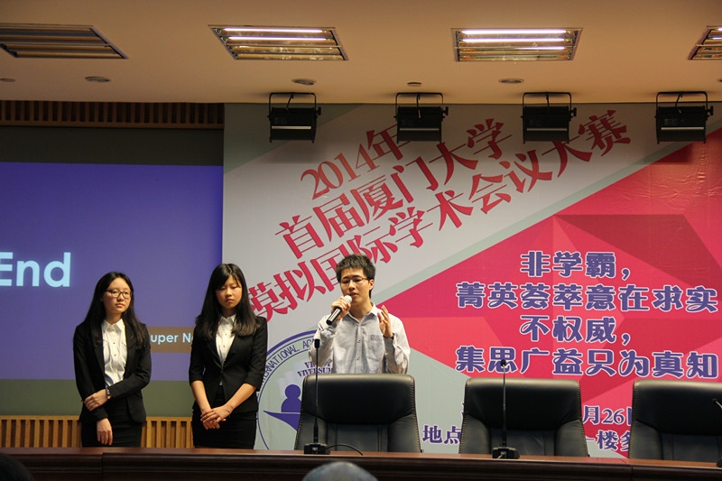 The First XMU Model International Academic Conference Final was successfully closed after four hours of competition at science and art center on April 26th. It was hosted by Academic Affairs Office, Modern Education Technology and Practice Center, College of Foreign Languages and Cultures of XMU, organized by the Department of English Language and Literature and Communist Youth League Committee of College of Foreign Languages and Cultures.