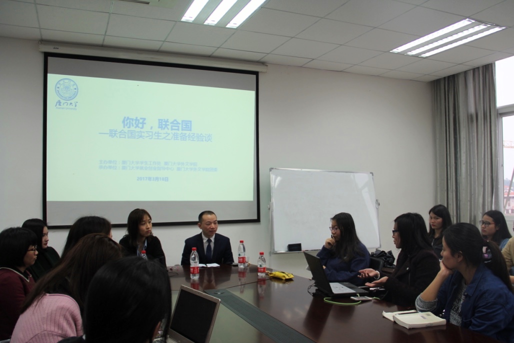 FromMarch 17 to 18, a range of interviews, seminars and salons regarding the internship at the United Nations were held at the College of Foreign Languages and Cultures (CFLC) of Xiamen University. As part of “Global Pie” series of exchange activities, this event was co-hosted by the Student Affairs Office of XMU and CFLC, and co-organized by the XMU Center of Students Employment and Entrepreneurship and the Communist Youth League of CFLC. Chen Pushun, a Ph.D candidate of CFLC who was once an intern at the UN Headquarters, and Shao Hongjing, a CFLC graduate of 2016 who also worked as an intern with the United Nations Human Settlements Program (UNHSP), were invited back to the campus to share their UN internship experience with the students of XMU through various activities where they two talked about what they had seen and heard as interns with the UN and offered some specific guidance and help to the XMU students who wish to land internships with international organizations.