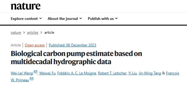 On 7 December, Professor Wang Weilei from theCollege of Ocean and Earth Sciences, Xiamen University, together with domestic and international researchers, published on the latest progress in the field of the oceanic biological carbon pump. The related achievements were published in the leading international journalNature under the title of “Biological carbon pump estimate based on multidecadal hydrographic data”. The study utilizes a self-developed inversion procedure to derive the global distribution of the oceanic biological carbon pump and reveal the important role of advection and diffusion export (including mixed-layer-depth pump, subduction pump, and diffusion export of dissolved organic carbon, etc.) in the global biological carbon pump and the deep ocean carbon budget, which provides an important reference for the estimation of the ocean carbon sink under the background of global change.