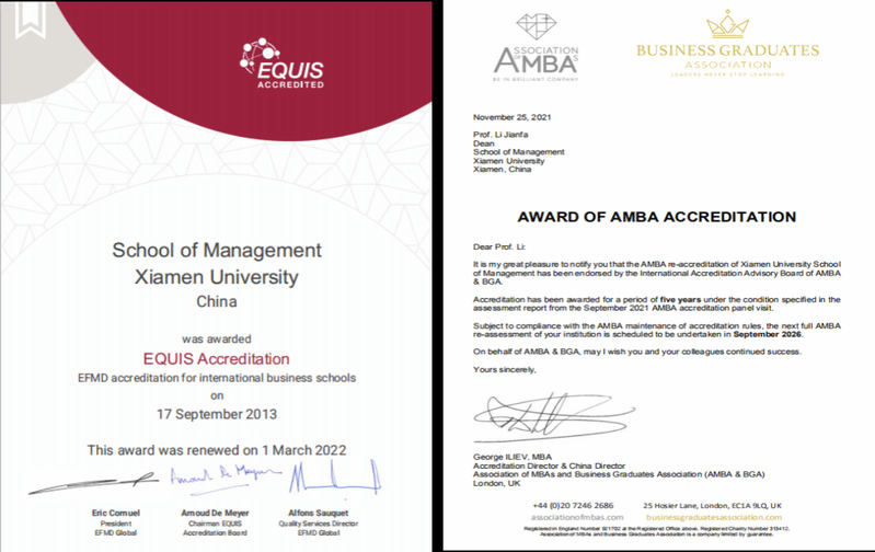 Recently, School of Management, Xiamen University has officially passed the evaluation of European Quality Improvement System (EQUIS), receiving another five-year accreditation, which is the highest standard within EQUIS. Prior to this achievement, School of Management has already been awarded another accreditation for a period of five years by the Association of MBAs (AMBA) on November 26, 2021. So far School of Management has gained double highest-standard accreditations.