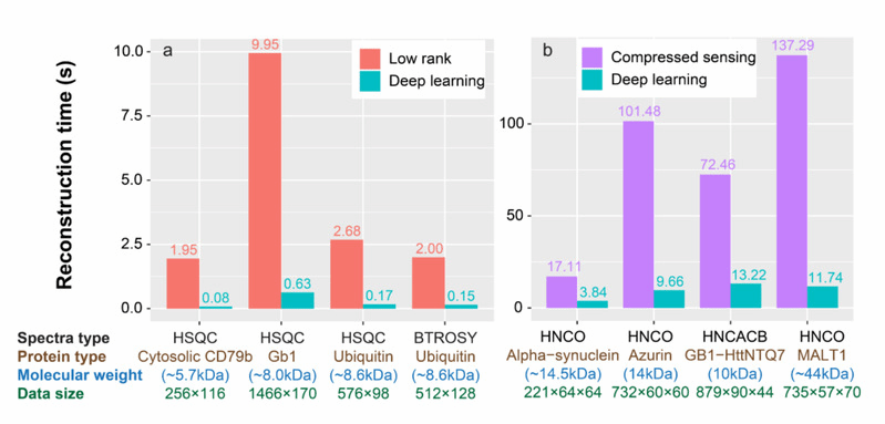 [Figure 4]. Computational time for the reconstructions of (a) 2D spectra and (b) 3D spectra with low rank, compressed sensing and deep learning. Note: The listed below each bar are spectra type, the corresponding protein, molecular weight, and spectra size, respectively. For 2D (3D) spectra size of the directly detected dimension is followed by size(s) of the indirect dimension(s).