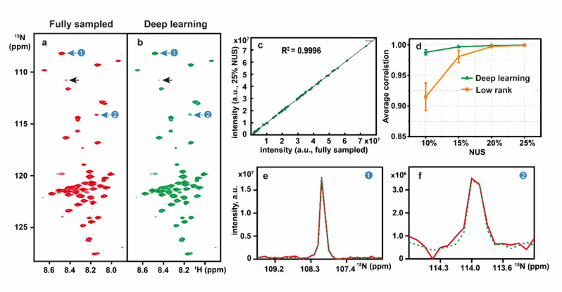 [Figure 3]. Reconstruction of a 2D1H–15N HSQC spectrum of the cytosolic domain of CD79b protein from the B-cell receptor. (a) and (b) are the fully sampled spectrum and deep learning NMR reconstruction from 25% NUS data, respectively. (c) Peak intensity correlations between fully sampled spectrum and reconstructed spectrum. (d) denotes the peak intensity correlation obtained with the deep learning and low rank methods under different NUS levels. (e) and (f) are zoomed out 1D15N traces of (a). Red and green lines represent the reference and the reconstructed spectra, respectively.
