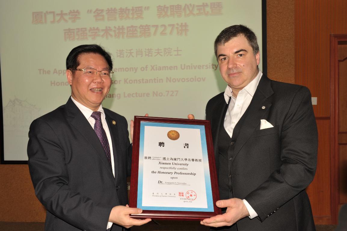 On 6 April, the 95thbirthday of Xiamen University,Kostantin Novoselov, the 2010 Nobel Prize winner in Physics, accepted the honorary professorship conferred by Xiamen University.