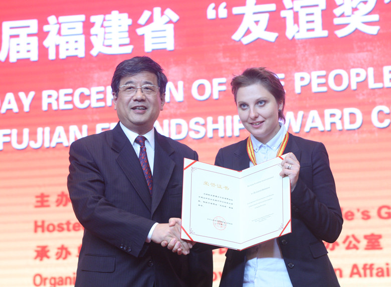 On September 29, the ninth award ceremony for “Fujian Friendship Award” and celebration of the 66thanniversary of People’s Republic of China was held in Fuzhou, seat of Fujian Province. Two foreign teachers of Xiamen University, Larisa Smirnova, from College of Foreign Languages and Cultures, and Holger Merlitz, from School of Physics and Mechanical & Electrical Engineering, received the awards for friendship.
