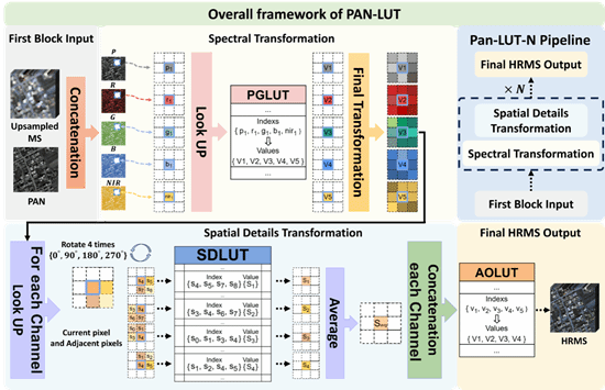 The method employs a PAN-guided look-up table for channel-wise spectral mapping and additional tables to capture fine-grained spatial details and adaptive local contexts. Containing fewer than 300K parameters, Pan-LUT processes an 8K resolution image in under one millisecond on a single NVIDIA GeForce RTX 2080 Ti GPU.