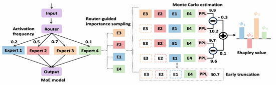 It quantifies each expert's contribution via Shapley value, avoiding exhaustive evaluations. Monte Carlo sampling is used to approximate Shapley values efficiently, and two additional strategies – Early Truncation and Router-Guided Importance Sampling – further improve sampling accuracy and efficiency.