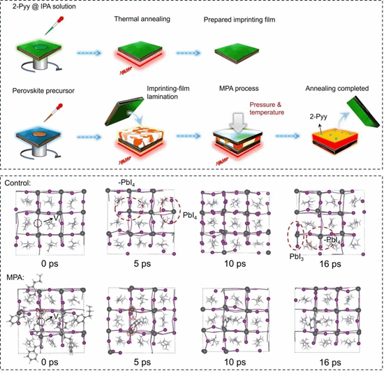 The MPA approach deposits a 2-pyridylethylamine molecular layer on the perovskite surface during thermal annealing, thereby forming a solid-state bidentate coordination complex with undercoordinated lead ions. This process stabilizes the lead-iodine framework in real time, simultaneously promoting crystallization and suppressing defect formation.