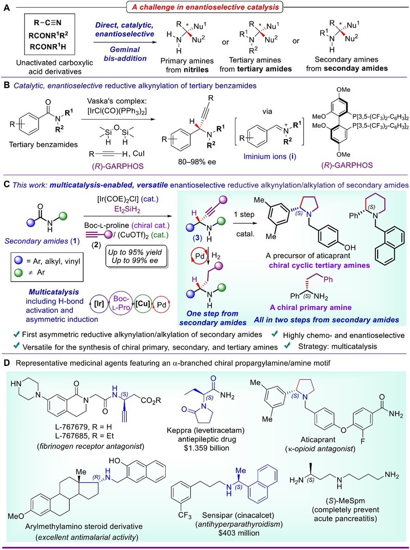 Abstract: The catalytic asymmetric geminal bis-nucleophilic addition to nonreactive functional groups is a type of highly desirable yet challenging transformation in organic chemistry. Here, we report the first catalytic asymmetric reductive/deoxygenative alkynylation of secondary amides. The method is based on a multicatalysis strategy that merges iridium/copper relay catalysis with organocatalysis. A further combination with the palladium-catalyzed alkyne hydrogenation allows the one-pot enantioselective reductive alkylation of secondary amides. This versatile protocol allows the efficient synthesis of four types of α-branched chiral amines, which are prevalent structural motifs of active pharmaceutical ingredients. The protocol also features excellent enantioselectivity, chemoselectivity, and functional group tolerance to be compatible with more reactive functional groups such as ketone and aldehyde. The synthetic utility of the method was further demonstrated by the late-stage functionalization of two drug derivatives and the concise, first catalytic asymmetric approach to the κ-opioid antagonist aticaprant.