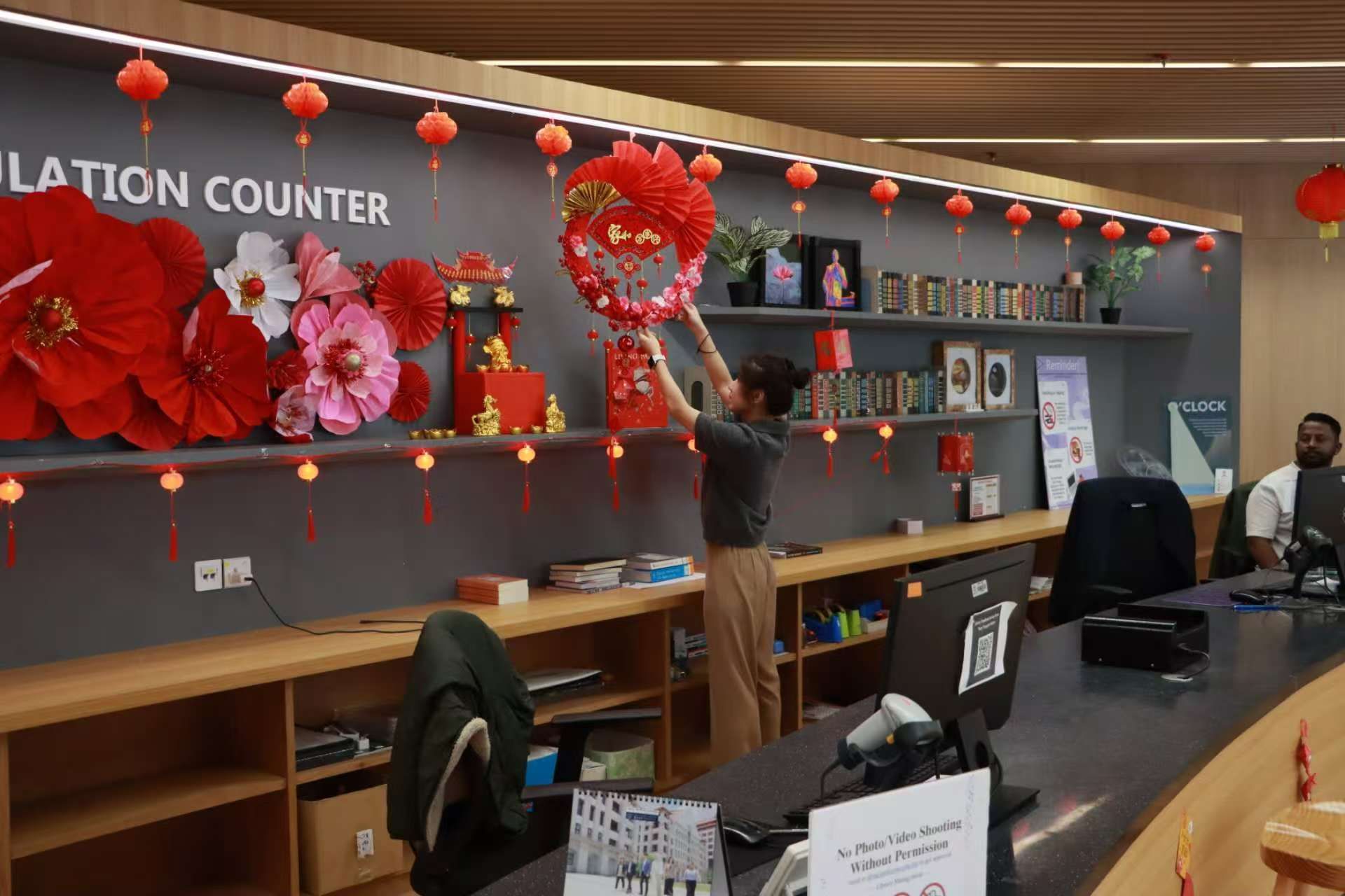 Librarian Tan Huoy Chyng adds festive touches to the library. [Photo/en.xmu.edu.cn]